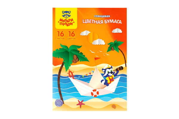 Цветная бумага мелованная Мульти Пульти Приключения Енота односторонняя 16 листов А4 16 цветов