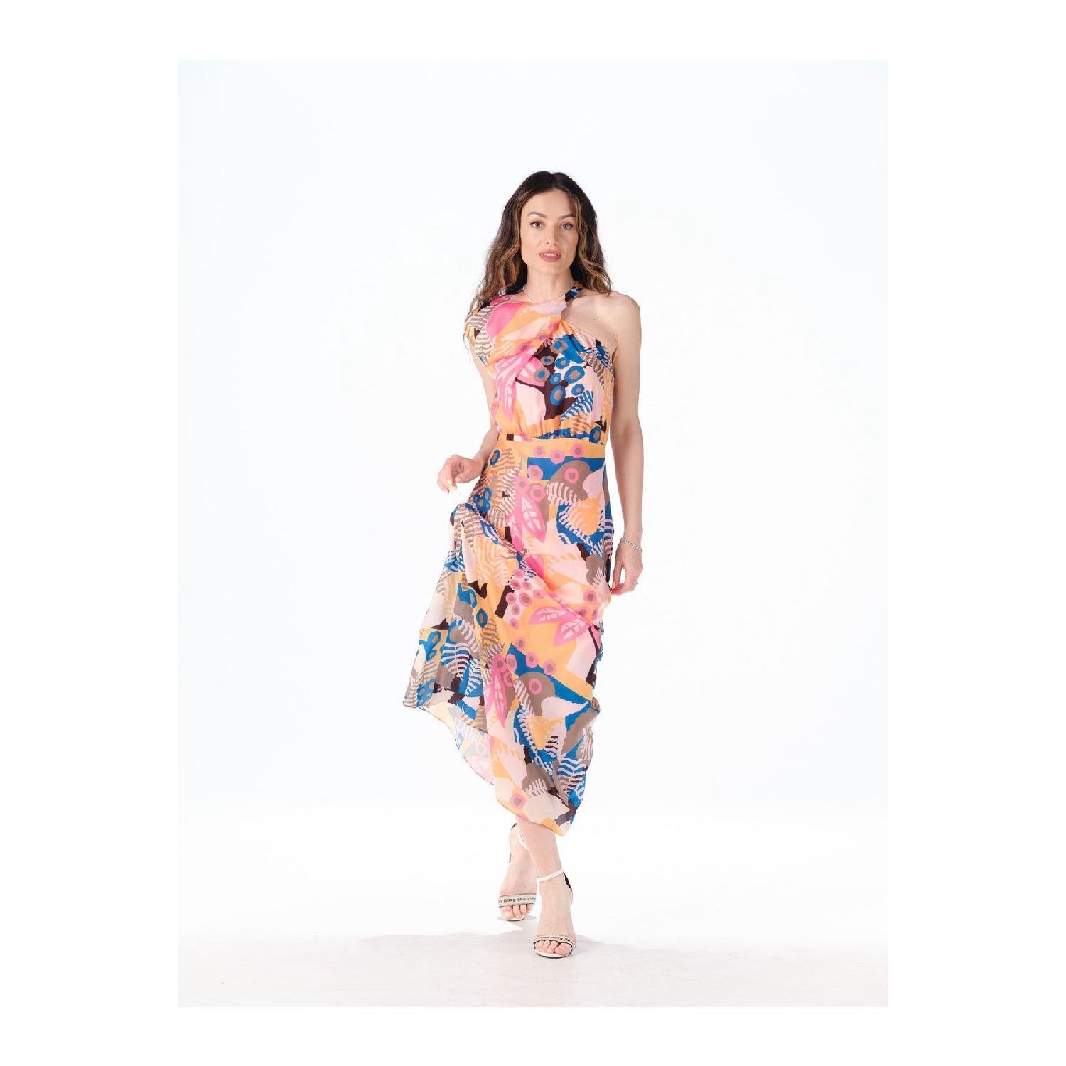 Цветное длинное платье с рисунком и различными деталями на плечах M чистый