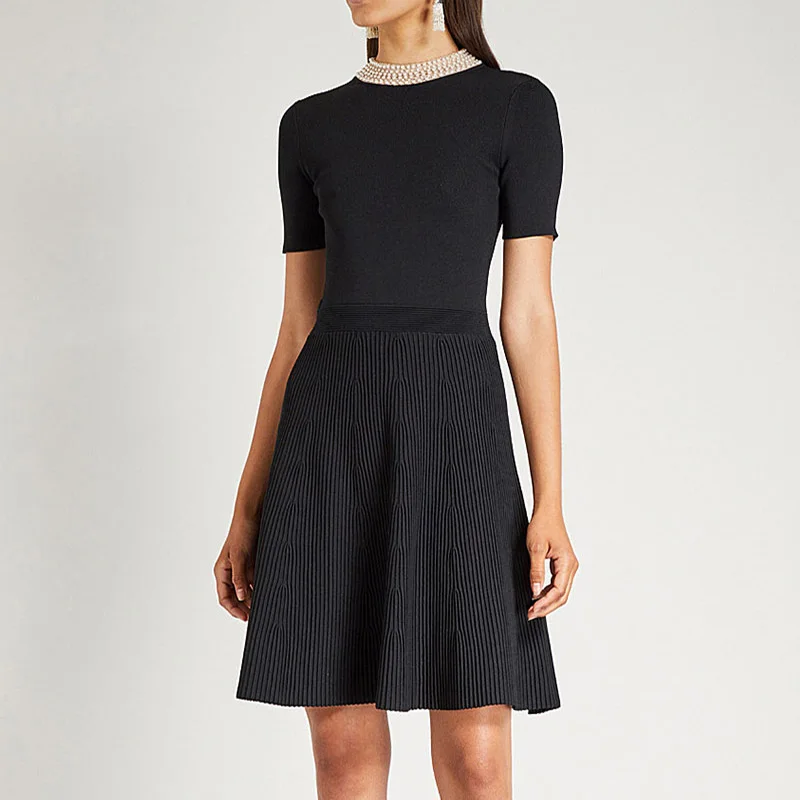 Elegant Knitted Summer Dress Women 2019 Luxury Beading O-neck Short Sleeve Knee-Length Black Dress Office Ladies A-line Dresses