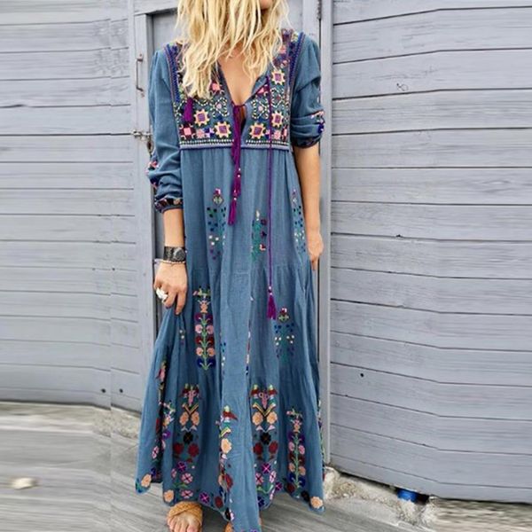 woman dress boho print lace up long sleeve dress plus size v neck party maxi dress ladies fashion beach clothing 2020, Black