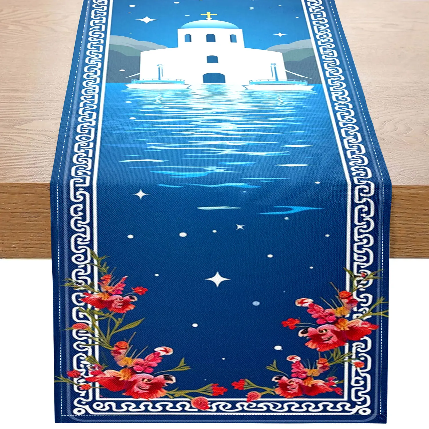Цельная дорожка для стола в греческом стиле Санторини, сине-белая церковь и звездное небо с волнистым узором. Подходит для украшения ресторана в средиземноморском стиле, Украшение дома на море, Тематическая вечеринка в стиле греческой культуры, Украшение