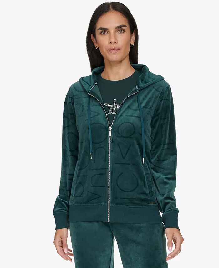 Женская толстовка с капюшоном из велюра с тональным логотипом и застежкой-молнией спереди Calvin Klein, зеленый