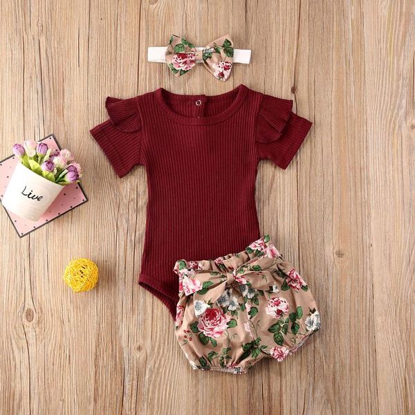 fashion baby girls clothes cotton short sleeve solid romper +flower short pants +headband summer 3pcs outfits set, White