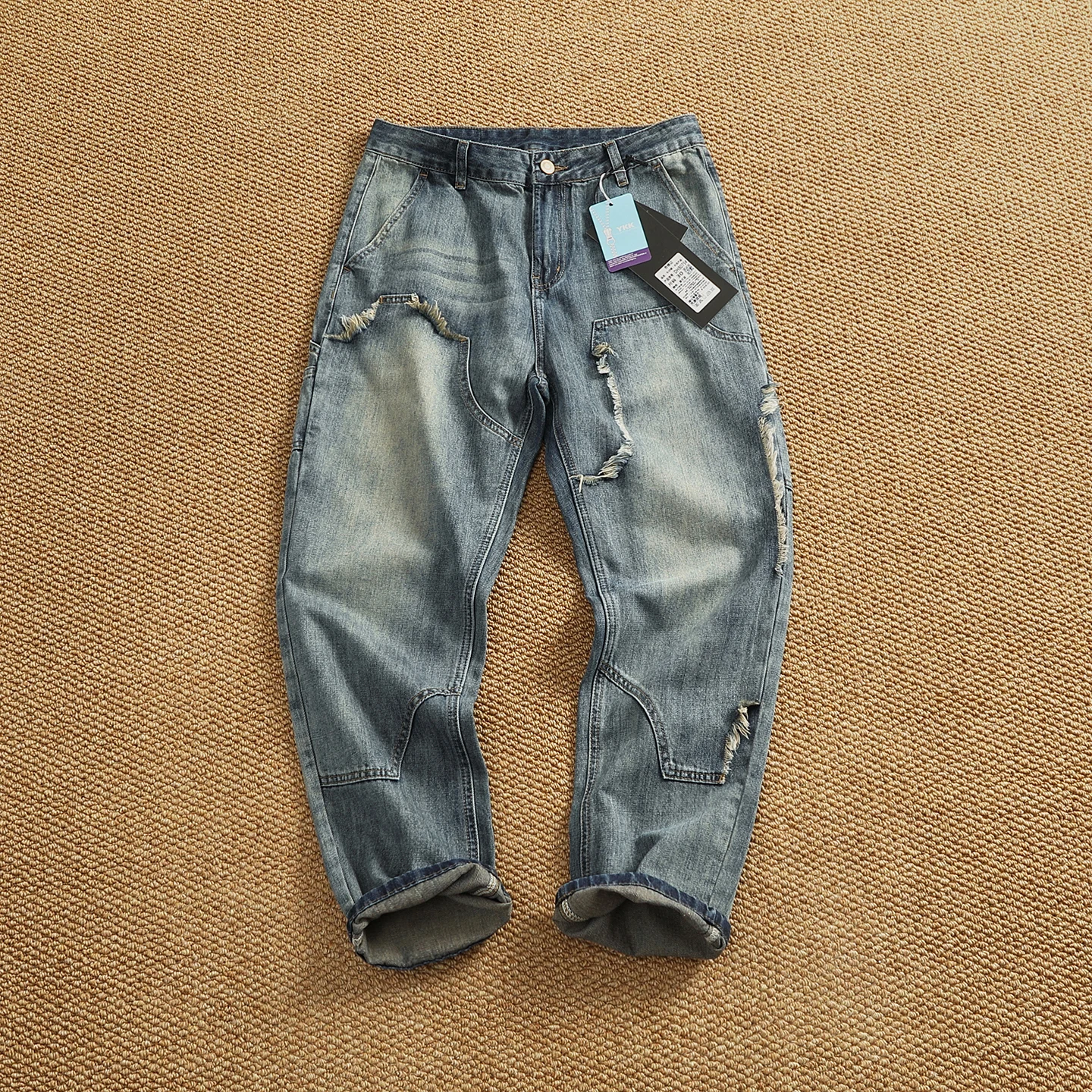 Retro logging equipment elements washing jeans trousers men's old loose straight tapered patch pants