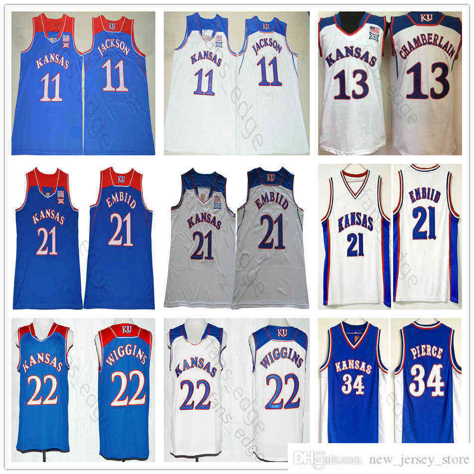 NCAA Kansas Jayhawks College Joel #21 Embiid Shirt Josh 11 Jackson Andrew 22 Wiggins Paul 34 Pierce Wilt 13 Chamberlain Basketball Jerseys, White