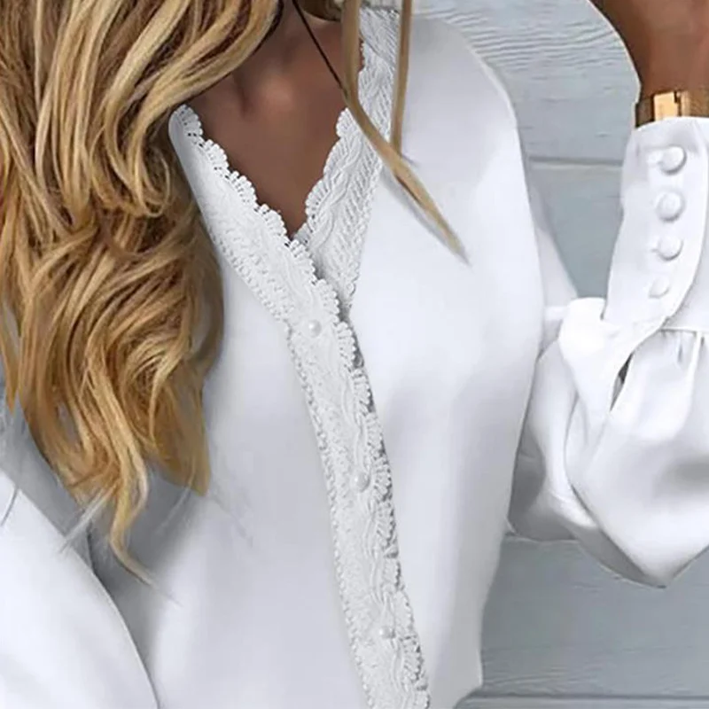 Chemise femme blanche Longue Lanterne a Manches Manchette a Volants Col V Boutons Feminins Minces Chemises 2021 Bureau d'ete