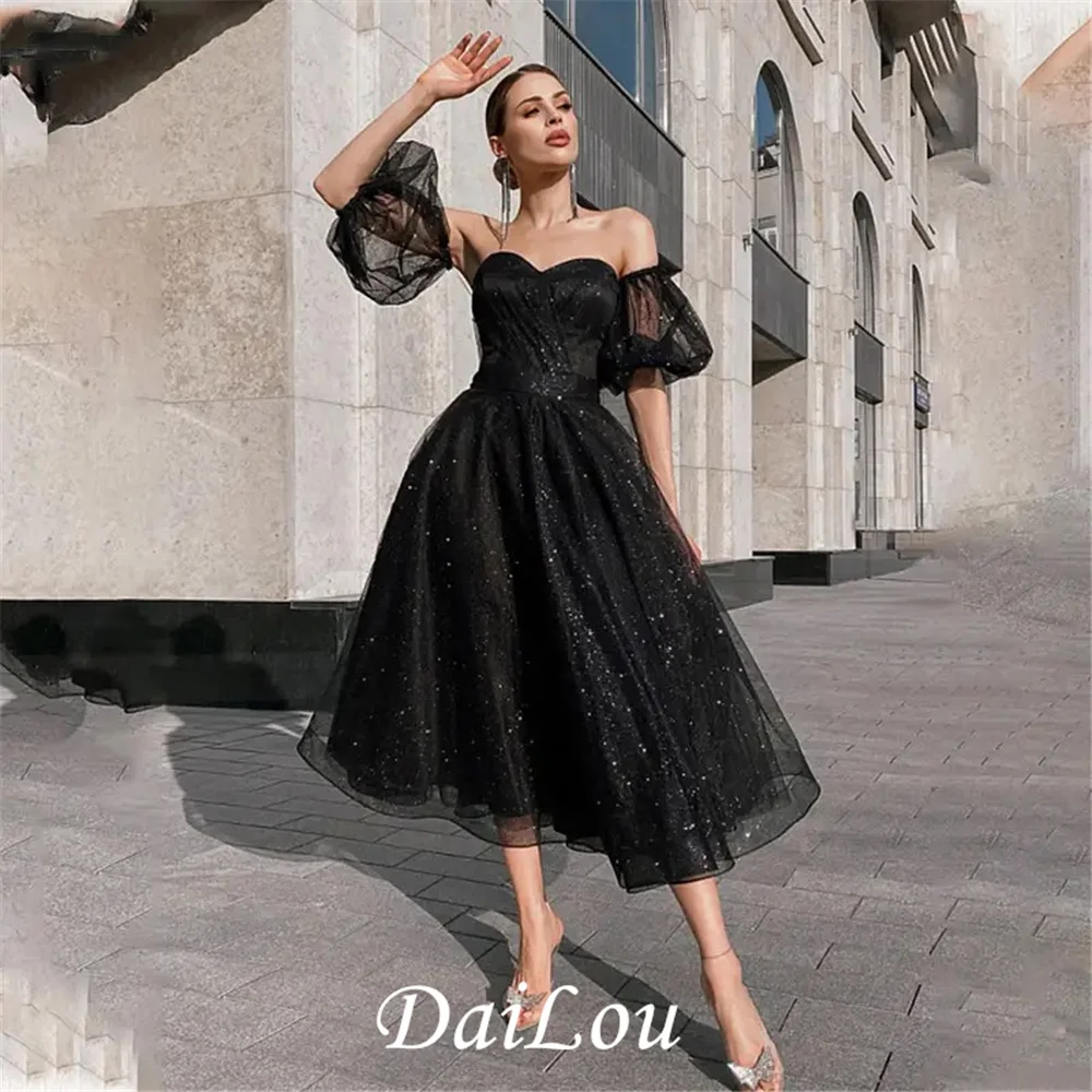 Черное ТРАПЕЦИЕВИДНОЕ платье без бретелек для выпускного вечера Пышное Платье С Коротким Рукавом Сексуальное Женское Платье длиной ниже колена