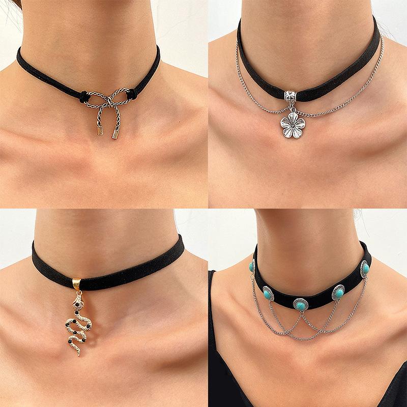 Черное бархатное ожерелье в стиле змеи с цветочным воротником и бантом, короткое колье