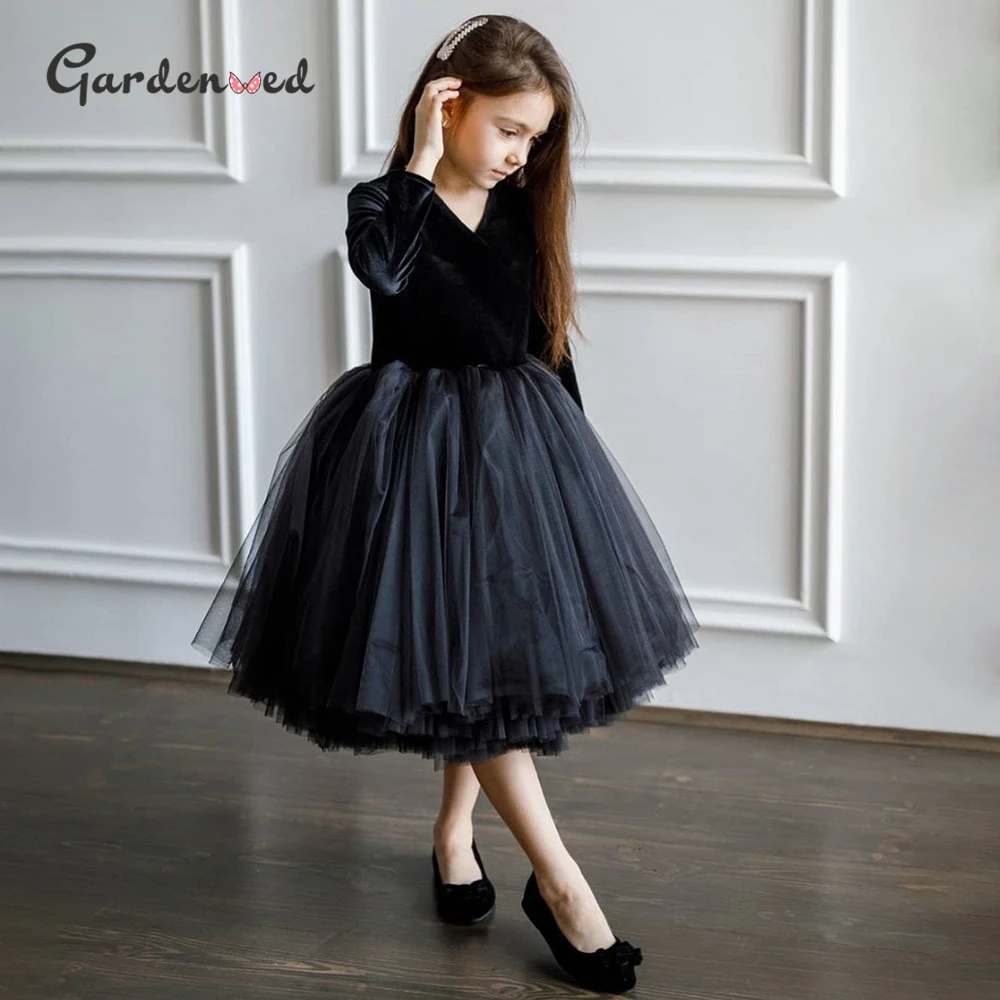 Черное вельветовое платье с цветочным узором, пышное свадебное платье с длинными рукавами для девочек, детское платье из органзы, платье принцессы на день рождения для девочек