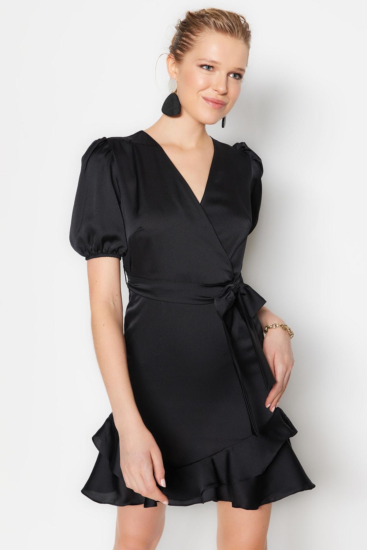 Черное двубортное атласное мини-платье с поясом TWOSS23EL00134..