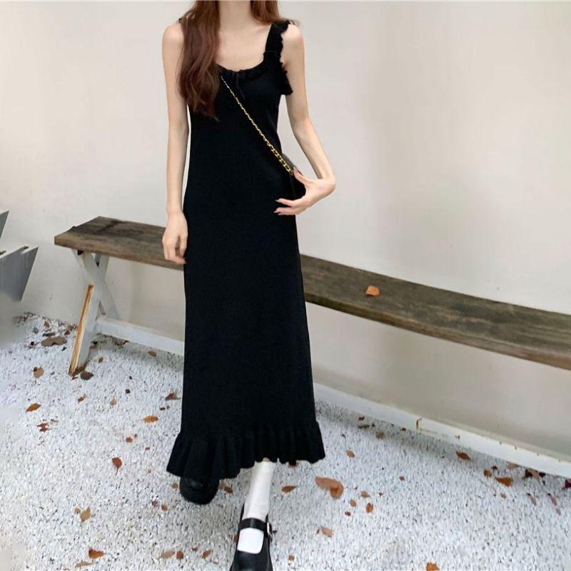 Черное деревянное платье с ушами, женская летняя новая корейская версия стиля чистого желания, горячая девушка, тонкие бретельки для подтяжек, длинная юбка выше колена