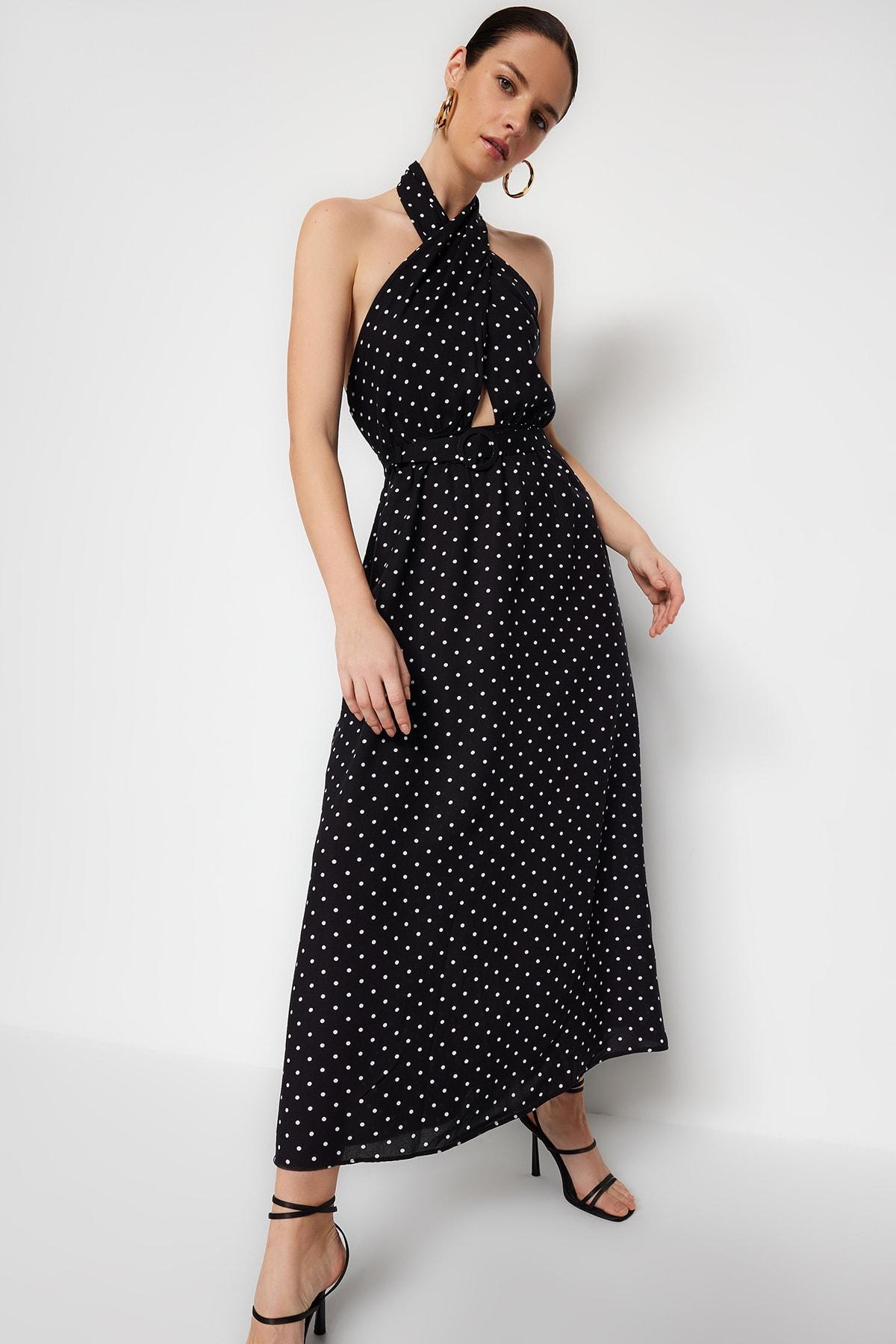 Черное платье-трапеция макси с поясом из тканого бретеля в горошек TWOSS23EL01395