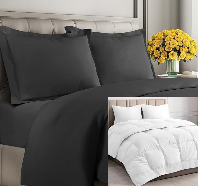Черное пуховое одеяло CGK Unlimited с одеялом (Cali King) — Очень мягкий пододеяльник с 1 наволочкой — Альтернативное белое пуховое одеяло — Роскошный постельный комплект