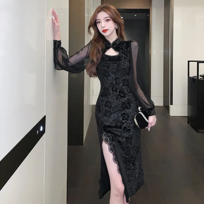 Черное улучшенное длинное платье Cheongsam, осень/зима 2024, элегантное молодежное золотое бархатное платье Ципао с длинными рукавами в стиле ретро