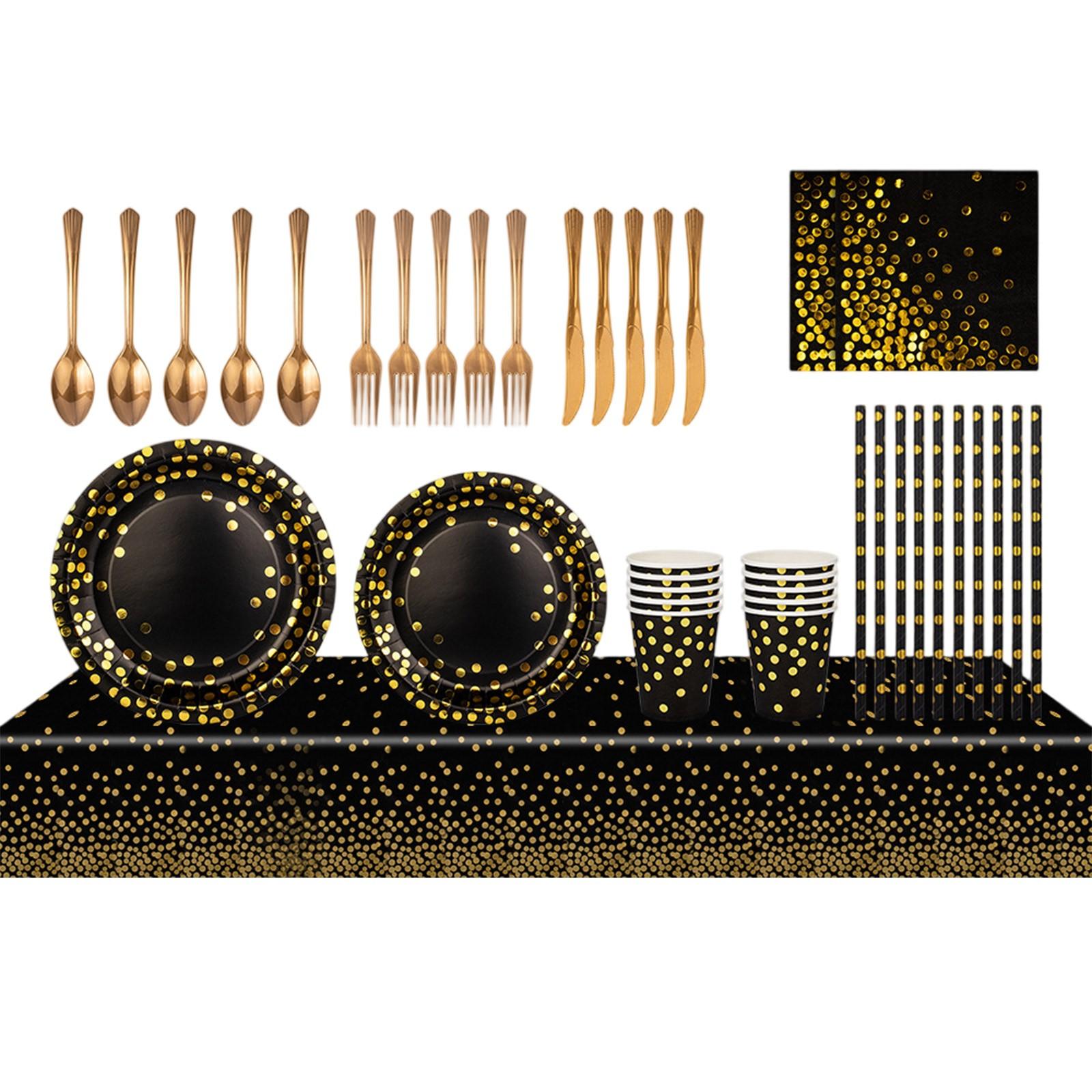Черно-золотая тематическая вечеринка по случаю дня рождения, одноразовая бумажная тарелка, столовые приборы, скатерть, набор ножей, вилок и ложек One Size