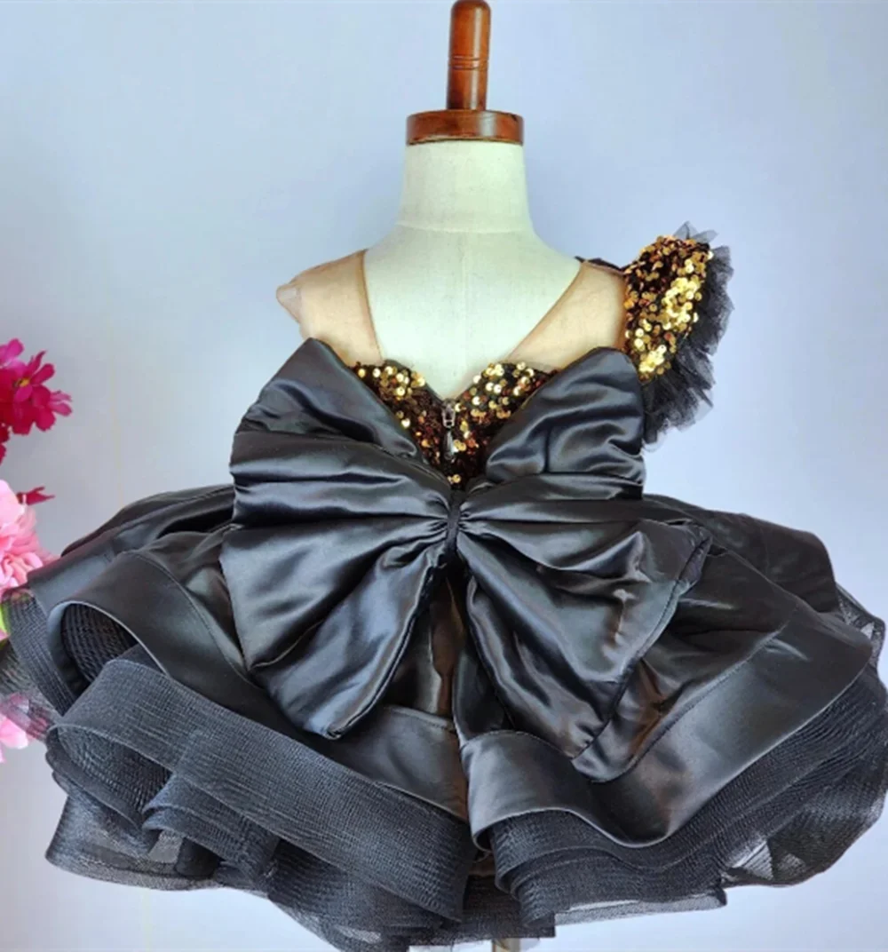 Черные платья с цветочным узором для девочек по индивидуальному заказу на свадьбу, пышное бальное платье с золотыми блестками и бантом для дня рождения для малышей