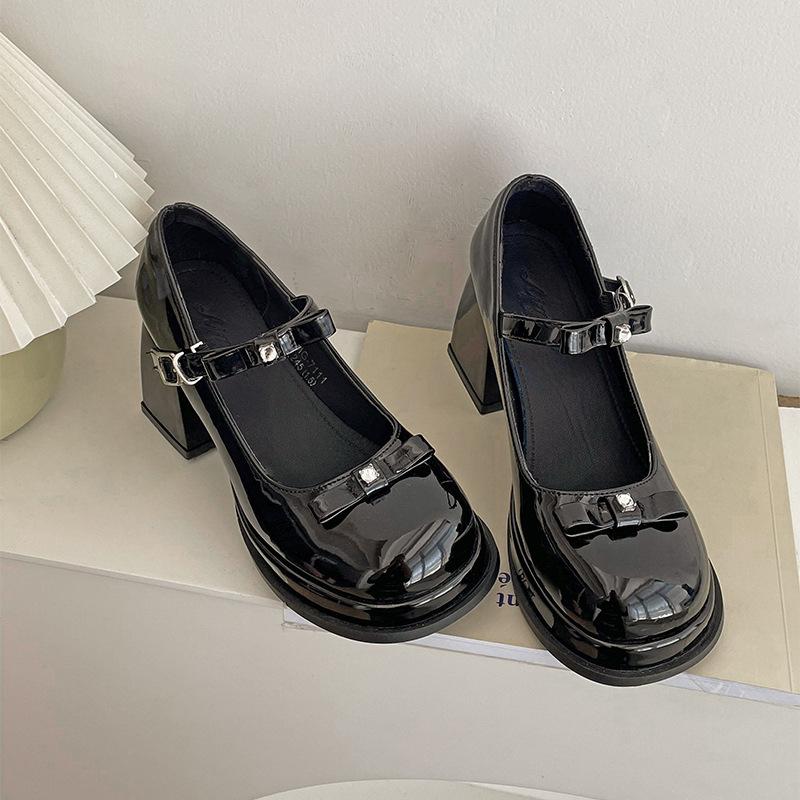 Черные туфли-лодочки с круглым носком, в стиле французского ретро, на толстом каблуке, из маленькой кожи, женские, новая летняя коллекция 2025 года, маленькие туфли Мэри Джейн на высоком каблуке 35