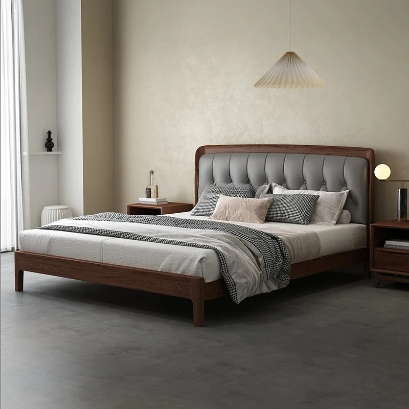Черный орех, массив дерева, кожа, мягкая спинка, итальянская простая брачная кровать, светлая роскошная двуспальная кровать из бревна, главная спальня