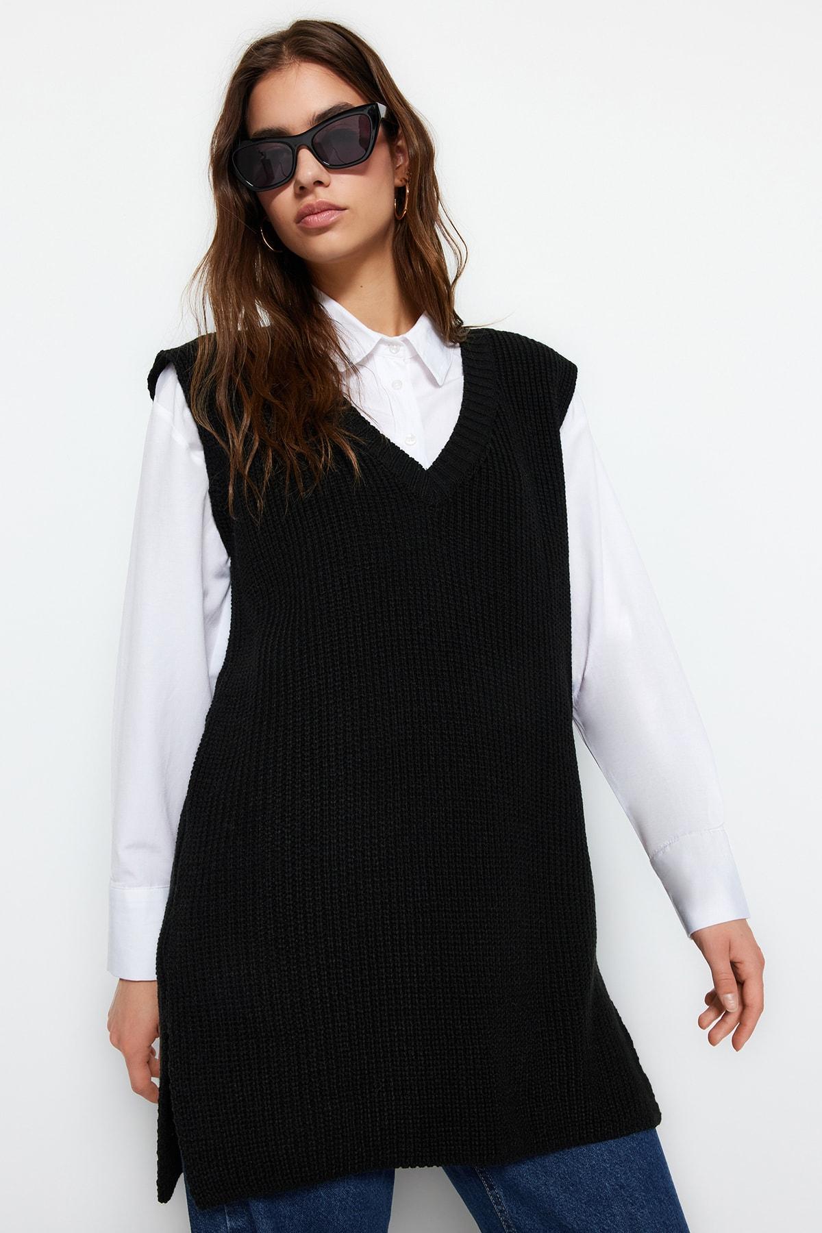 Черный трикотаж с V-образным вырезом и разрезом Салоники TCTAW24UV00003..