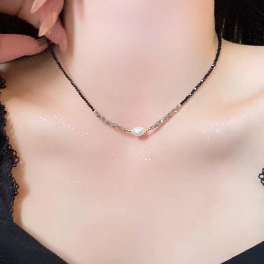 Чокер из черного хрусталя и жемчуга - Роскошное украшение на ключицу для женщин Crystal Pearl Necklace чёрный