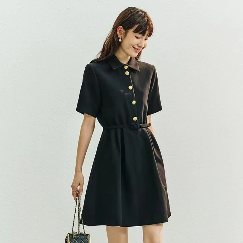 Новинка лета 2023, женское черное короткое трехмерное платье с маленьким отложным воротником и золотыми пуговицами и короткими рукавами