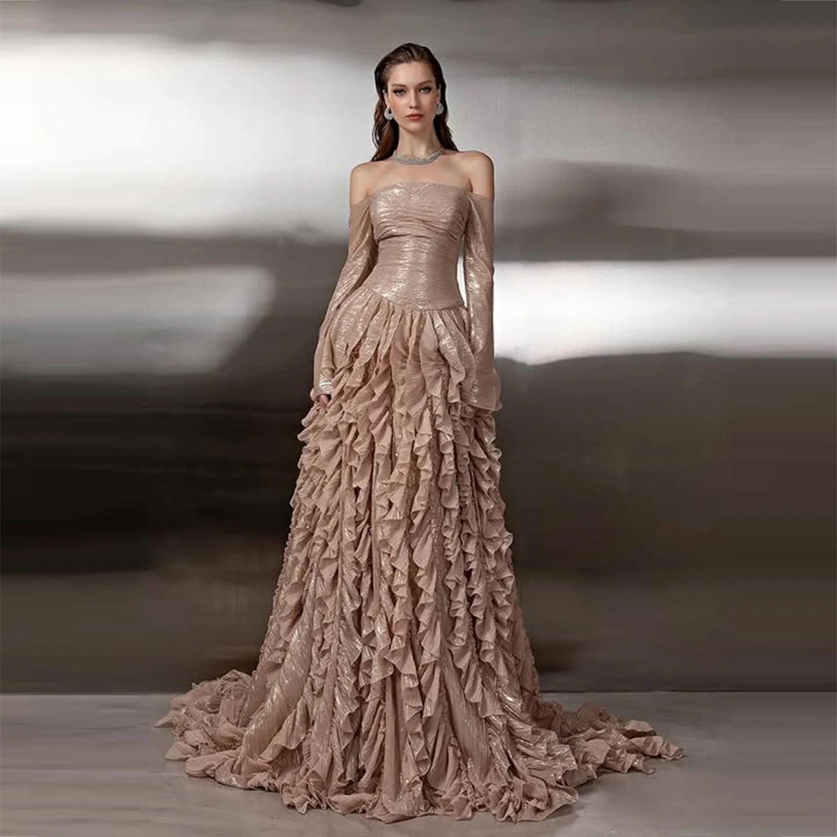 Шампанское с открытыми плечами Пром платья с длинными рукавами и оборками Вечерние платья трапециевидной формы на молнии сзади с скользящим шлейфом Вечернее платье