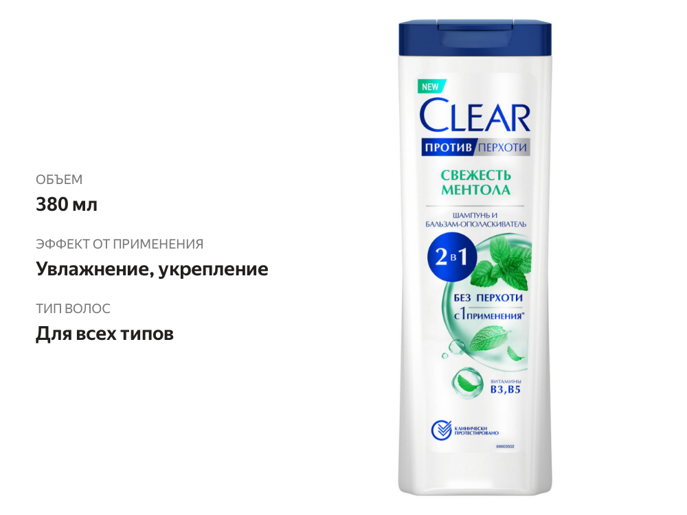 Шампунь и бальзам-ополаскиватель для волос Клиар Свежесть ментола 2в1 против перхоти 380 мл