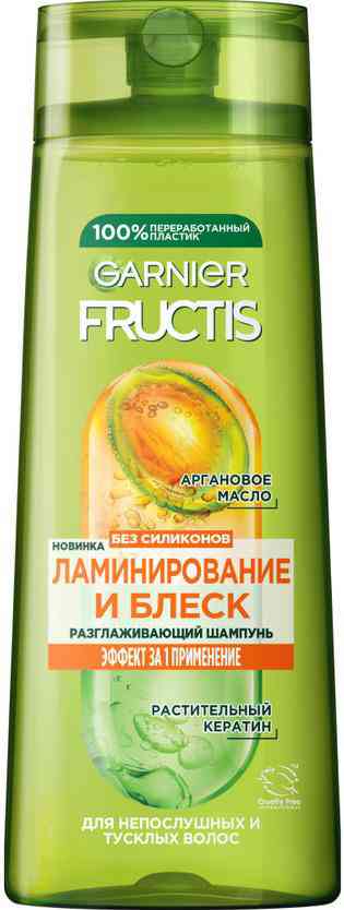 Fructis Шампунь для волос Фруктис Ламинирование и Блеск.Знакомо чувство, когда непослушные волосы нарушают все планы? А что, если можно быть уверенной в их безупречном виде: гладкие, послушные и ухоженные - в любой ситуации? Добавь в свою рутину ухода разглаживающий шампунь для волос Fructis Ламинирование и Блеск, обогащенный растительным кератином и аргановым маслом! Формула шампуня создана специально для ухода за непослушными тусклыми волосами и помогает вернуть им блеск уже после одного применения!*Открой секрет роскошного ухода в домашних условиях с Fructis Ламинирование и Блеск:- Инструментальный тест: блеск за одно применение*, до 72 часа гладкости!**- Бережное очищение: подходит для ежедневного применения и поддержания красоты волос.- Комплекс [аргановое масло + растительный кератин]: смягчает и придает блеск от корней до самых кончиков, устраняет пушистость.- Деликатный аромат: превращает домашние ритуалы красоты в настоящее наслаждение.- Без минеральных масел.- Удобный объем: выбери свой идеальный формат - 250 мл или 400 мл.Шампунь идеально подойдет для непослушных и тусклых волос. Шампунь можно использовать для дополнительного ухода за непослушными и тусклыми волосами, которые часто подвергаются горячим укладкам и другим повреждениям.Для достижения оптимального эффекта используй всю гамму средств для укрепления и блеска волос Fructis Ламинирование и Блеск:- Шампунь бережно очищает и разглаживает волосы, подготавливает их к нанесению других уходовых средств.- Бальзам облегчает расчесывание, придает волосам красивое сияние.- Маска интенсивно питает и восстанавливает структуру волоса, устраняя пушистость и усиливая блеск.- Несмываемый cпрей обеспечивает комплексный уход, делает волосы гладкими и послушными без эффекта утяжеления.Не откладывай преображение на потом! Закажи Fructis Ламинирование и Блеск прямо сейчас и ощути разницу уже после первого применения!* Инструментальный тест при использовании шампуня, бальзама-ополаскивателя и маски.**Инструментальный тест при использовании шампуня и бальзама-ополаскивателя.