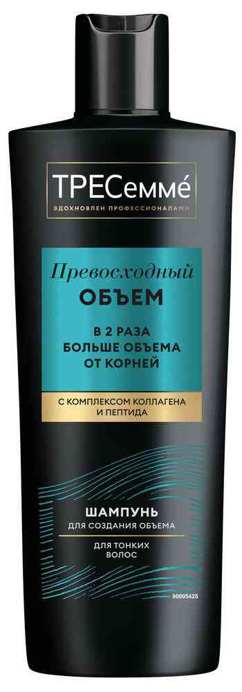 ТРЕСеммé Превосходный Объем - шампунь для объема волос, вдохновленный профессиональными уходовыми средствами. Шампунь с комплексом коллагена и пептида дарит мгновенный результат: в два раза больше объема от самых корней’!Включите шампунь для волос женский ТРЕСеммé Превосходный Объем в ваш бьюти-уход и притягивайте взгляды головокружительной объемной прической:- Шампунь для объема волос от корней мягко очищает волосы и кожу головы от избытков себума и загрязнений.- Формула с комплексом коллагена и пептида ухаживает за волосами, придает мягкость и мгновенно преображает пряди.- Шампунь женский дарит воздушный объем от самых корней.- Средство отлично взбивается в пену и легко смывается водой, а приятный аромат делает уход за волосами еще приятнее.Шампунь идеально подойдет для тонких волос и сделает их более объемными, красивыми и блестящими. Также средство для объема волос можно использовать для увеличения плотности’’ волос, чтобы они выглядели ухоженными и сияющими.Для максимального эффекта объемной прически дополните ваш уход другими продуктами из коллекции Превосходный Объем. От создания безупречного образа вас отделяет всего четыре шага:1. Очистите волосы шампунем для объема.2. Нанесите кондиционер для воздушного объема.3. Нанесите маску для уплотнения волос.4. Используйте спрей, чтобы зафиксировать воздушный объем от корней на весь день.В 1948 году в салонах красоты Нью-Йорка был создан ТРЕСеммé – бренд, позволяющий женщинам выглядеть и чувствовать себя уверенно. И все благодаря прическе! ТРЕСеммé вдохновляется профессиональными салонными разработками и предлагает эффективные решения для роскошных волос.’инструментальный тест: шампунь и кондиционер по сравнению с волосами до мытья.’’волосы визуально более густые и плотные.