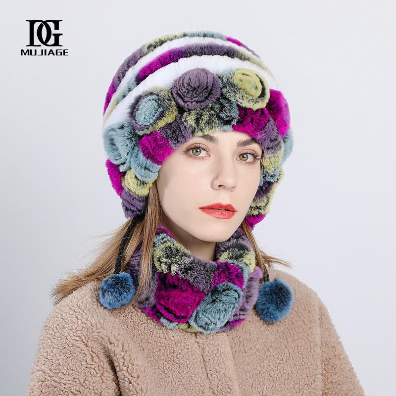 Шапка Женская Зимняя Новая из Кролика Рекс Утолщенная и Теплая Зимняя Универсальная и Милая Меховая Шапка Шарф Hat+Scarf Set