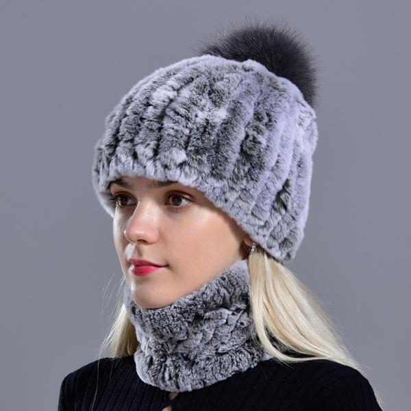 Шапка с помпоном из кроличьего меха, шарф-кольцо, комплект, женская зимняя модная вязаная шапка из натурального меха, грелка для шеи для девочек, женщин серый
