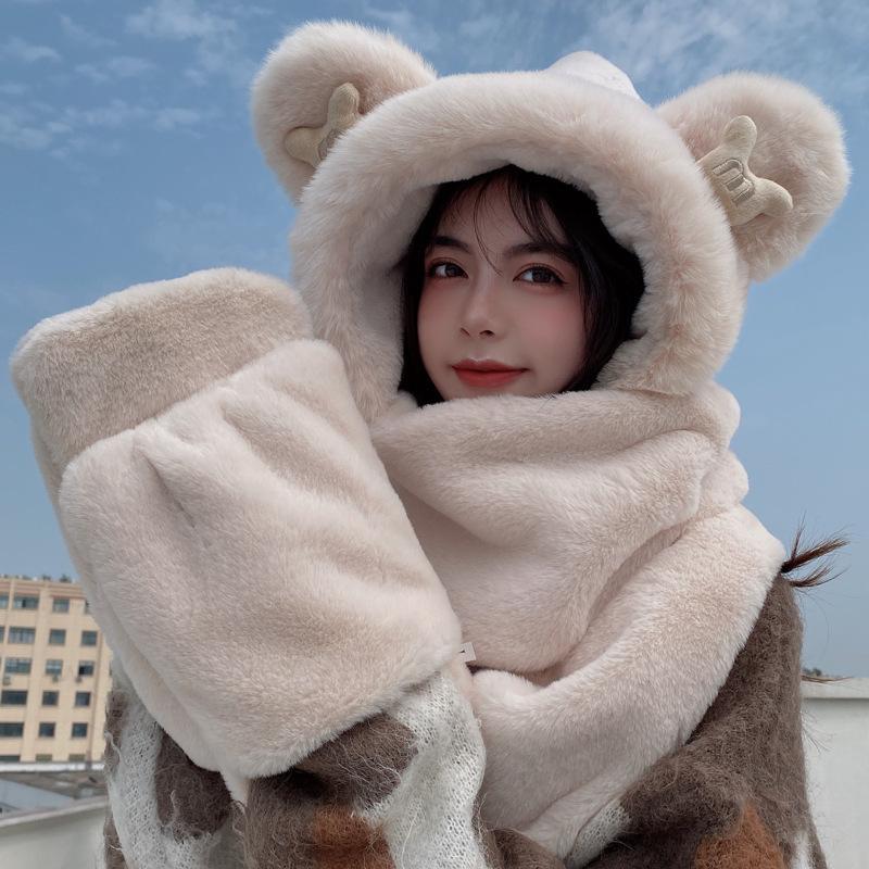 Шапка-шарф с мишкой, интегрированная, женская, зимняя, теплая, милая, плюшевая, велосипедный набор из трех предметов, мужские перчатки, шарф, зимний, ветрозащитный