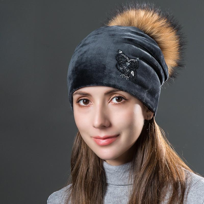 Шапки со стразами в виде совы для женщин, зимние теплые, плюс бархатные модные шапки с помпонами из натурального меха, женские шапки-бини темно серый