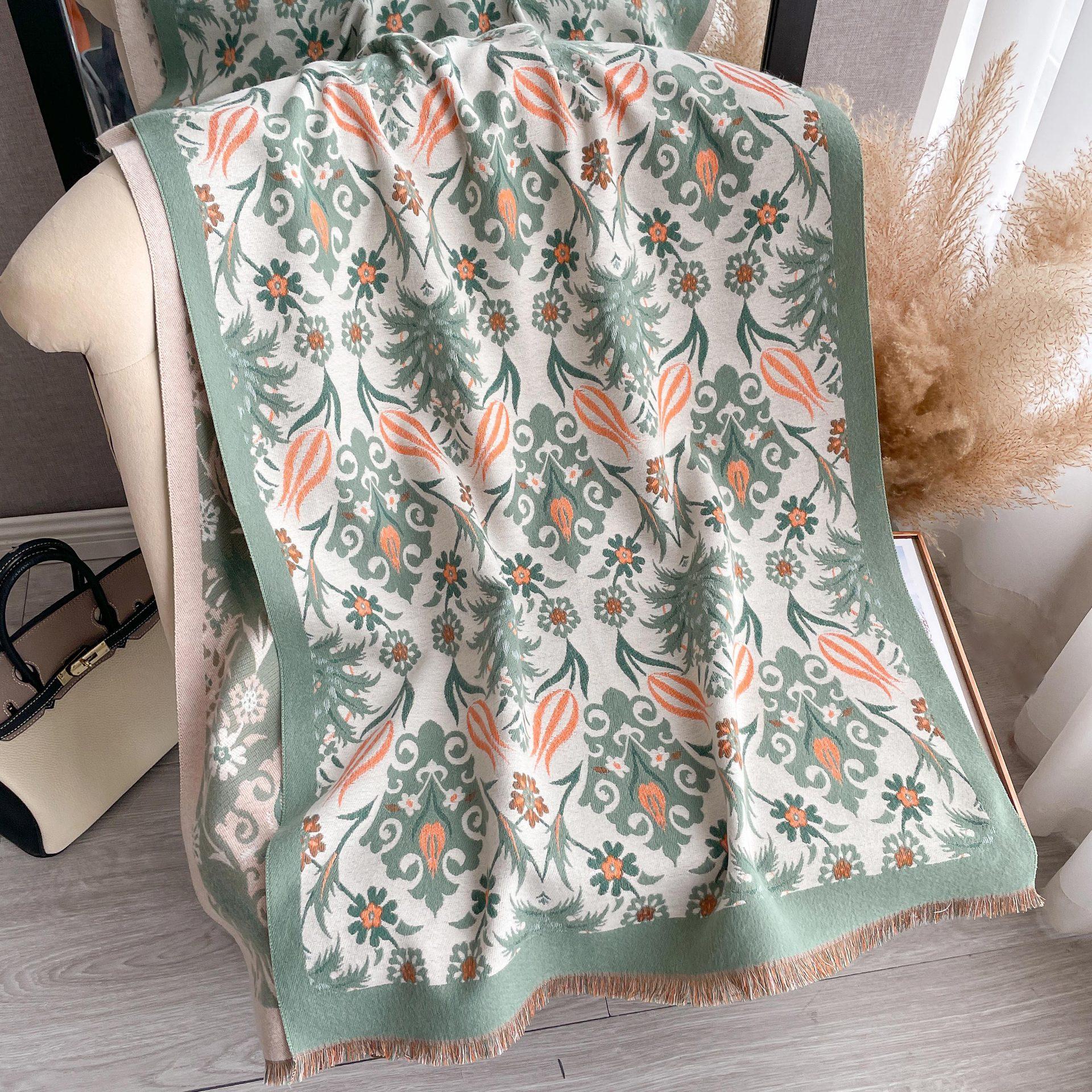 Шарф Женский Зимний Модный Утолщенный Имитация Кашемира Студенческий Шарф Защита Шеи Теплая Шаль Двусторонняя Печать 190*65cm зелёный