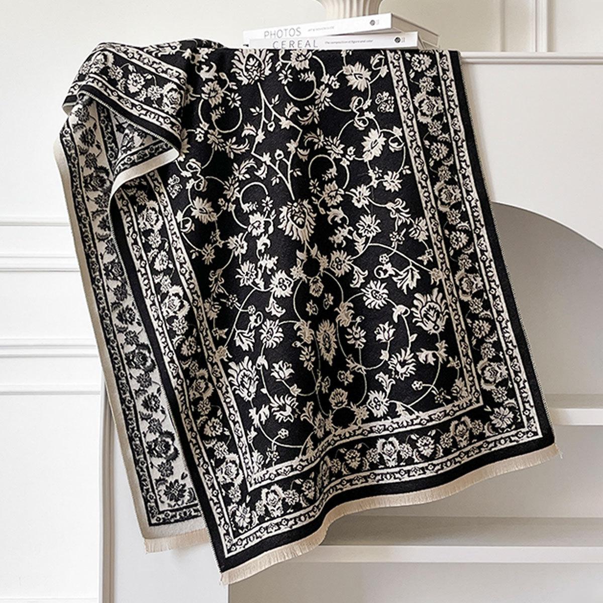 Шарф женский зимний с бахромой шаль фея ветер цветок универсальный кашемировый утолщенный теплый и холодный шарф двойного назначения 185*65cm чёрный