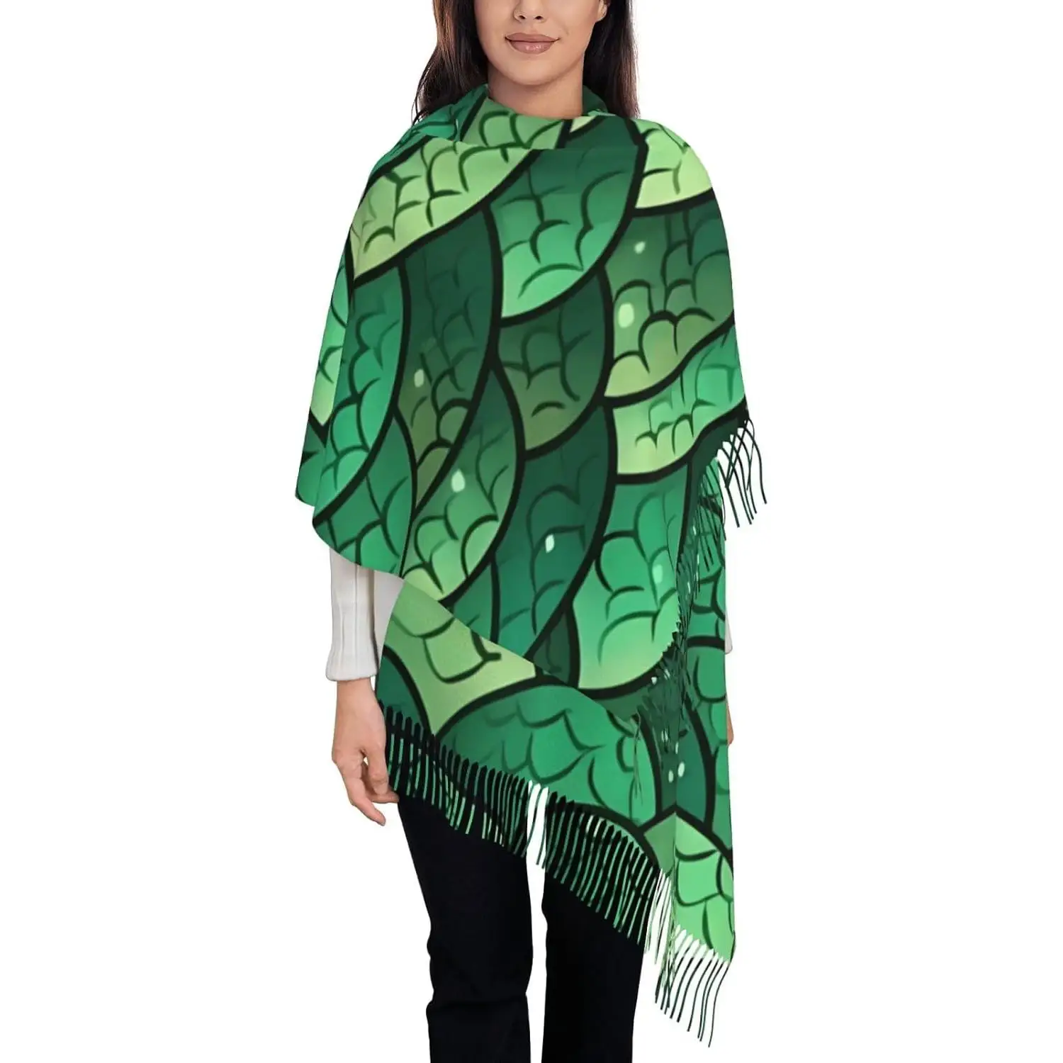 Шарф с кисточками и принтом зеленой рыбы, теплый шарф, шаль, шарф с бахромой, одеяло, шаль для подарка, женская весна, осень, зима