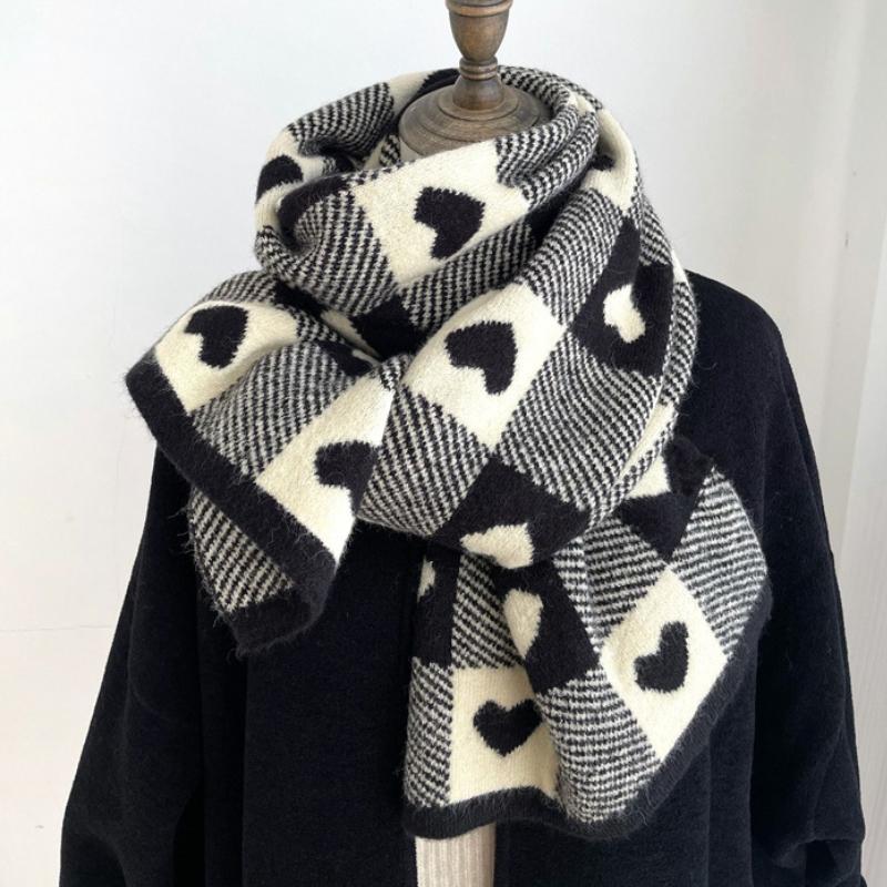 Шарф с сердечком, вязаный шарф, черно-белый клетчатый шарф, утолщенные теплые зимние женские шарфы, подарки на Рождество и Новый год чёрный