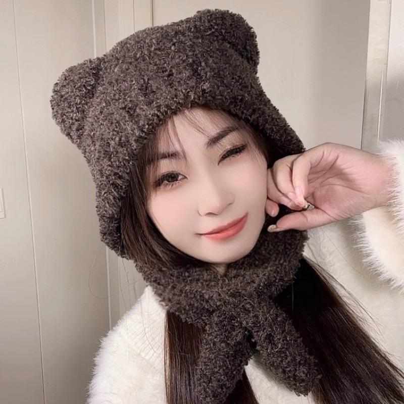 Шарф-шапка в виде медведя Цельный Двухкомпонентный Вязаная шерстяная шапка для женщин Осенью и зимой Теплая Защита ушей Шапка Лей Фэна Тренд M(56-58cm)