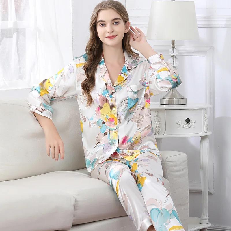 Шелковая женская пижама 100% шелк тутового шелкопряда весна и осень с длинными рукавами шелковая женская домашняя пижама 2XL