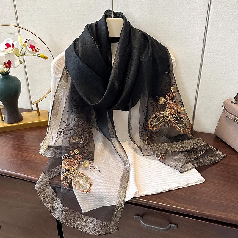 Шелковая шерсть Вышитый шелковый шарф Женская мода Зарубежный стиль Зимний теплый шарф Холодная шаль Тонкий стиль 180*70 чёрный