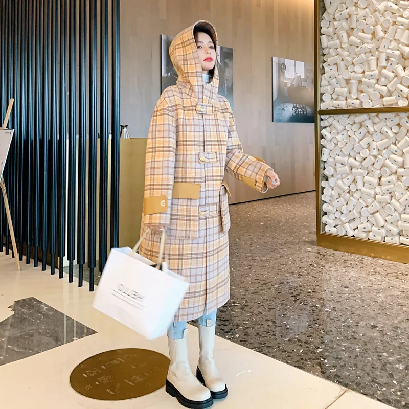 Шерстяная куртка Женская осенне-зимняя длинная плотная клетчатая куртка в стиле ретро с пряжкой рога и капюшоном модный дизайн прямая Своб...