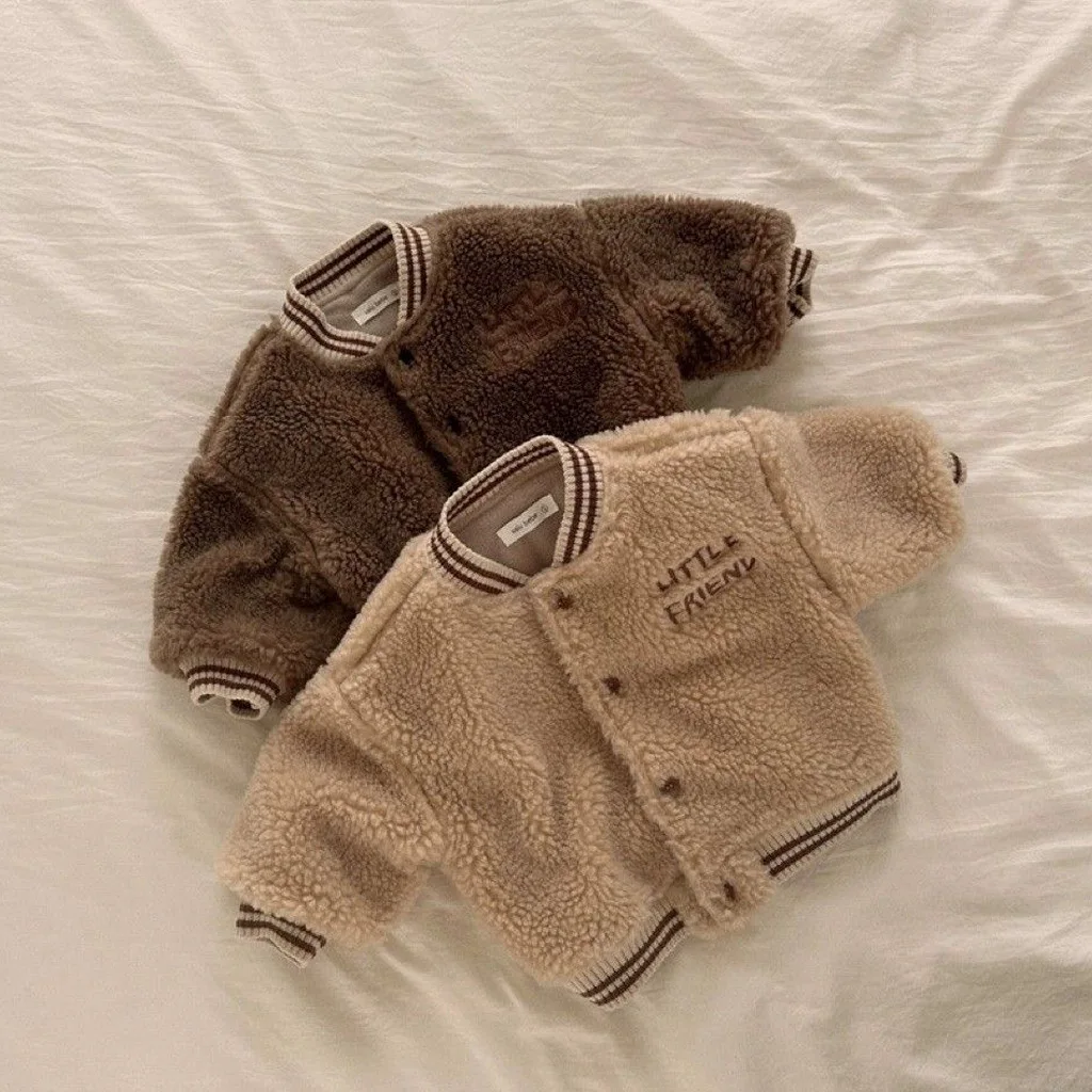 Шерстяная куртка ягненка для маленьких мальчиков, плотное детское теплое пальто с вышивкой букв для девочек, зимняя бейсбольная куртка на одной пуговице для маленьких мальчиков