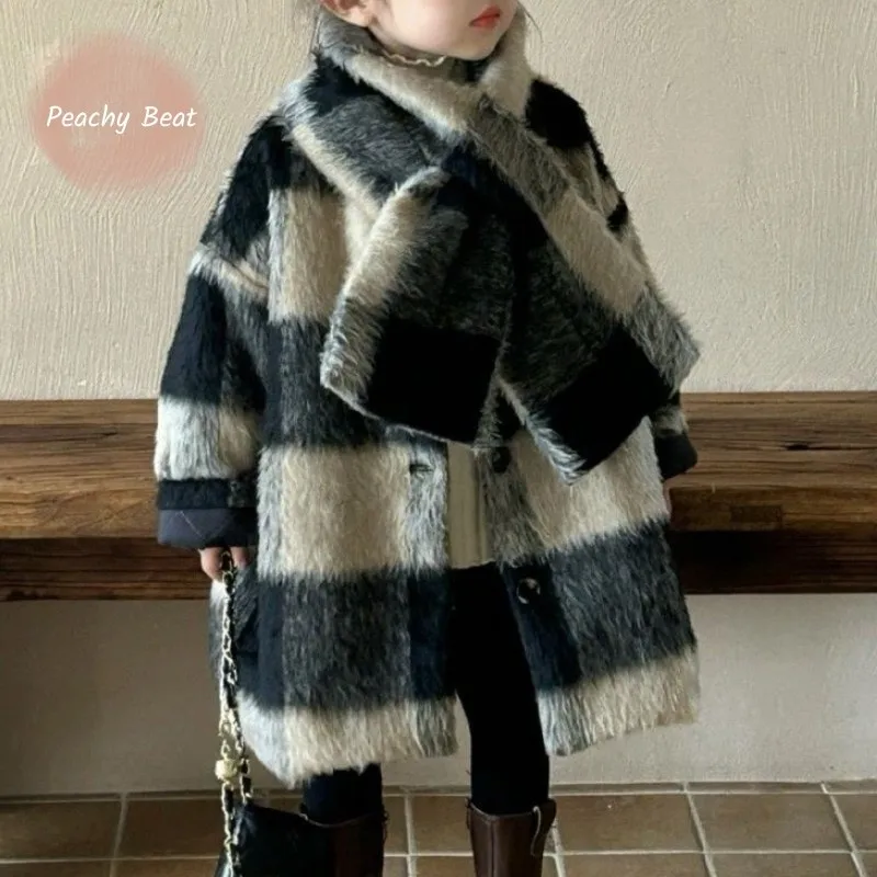Шерстяное клетчатое пальто принцессы для маленьких девочек с шарфом, зимняя верхняя одежда с хлопковой подкладкой для малышей, плотная теплая детская одежда, От 1 до 10 лет