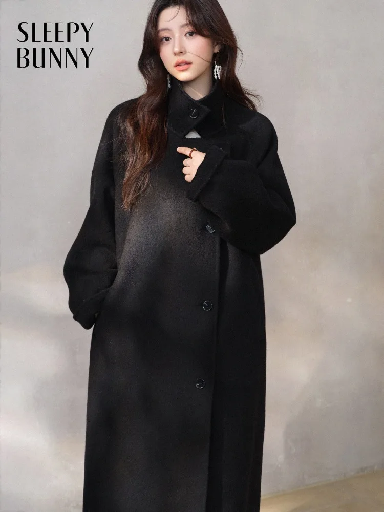 Шерстяное пальто женское элегантное длинное черное пальто винтажная двусторонняя зимняя куртка теплая минималистичная свободная верхняя одежда в стиле ретро