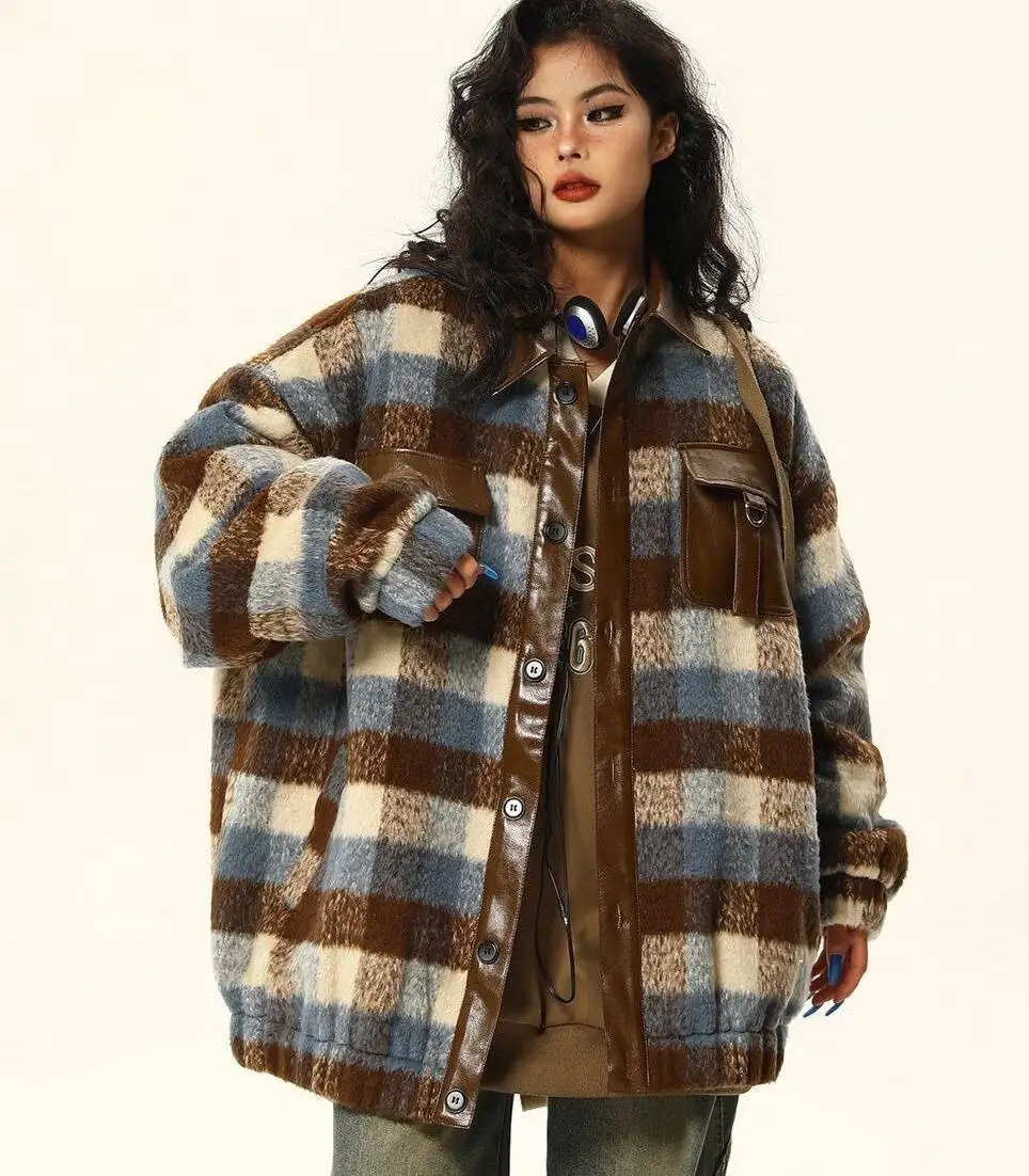 Шерстяные пальто, женское шерстяное пальто, утолщенное клетчатое осеннее пальто из синели на пуговицах, художественная уличная одежда, элегантная, нежная, для отдыха, уютная, ПР