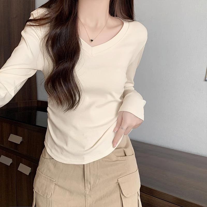 Шикарная белая футболка с v-образным вырезом и высокой талией, с длинными рукавами, женская ранняя осень, нерегулярный облегающий крой, универсальная нижняя часть рубашки, верхняя часть XL