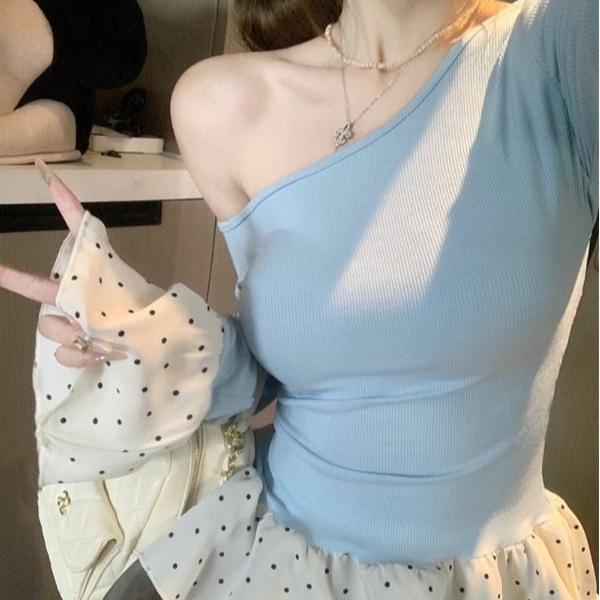 Шикарная черная футболка с длинными рукавами и открытыми плечами в корейском стиле, пэчворк в горошек Small чёрный