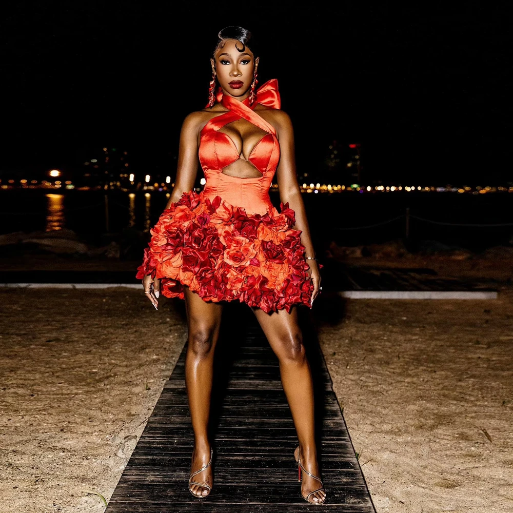 Шикарное мини-коктейльное платье ручной работы с цветочным принтом, сексуальное атласное вечернее платье с лямкой на шее и цветами, пышные короткие пышные платья знаменитостей