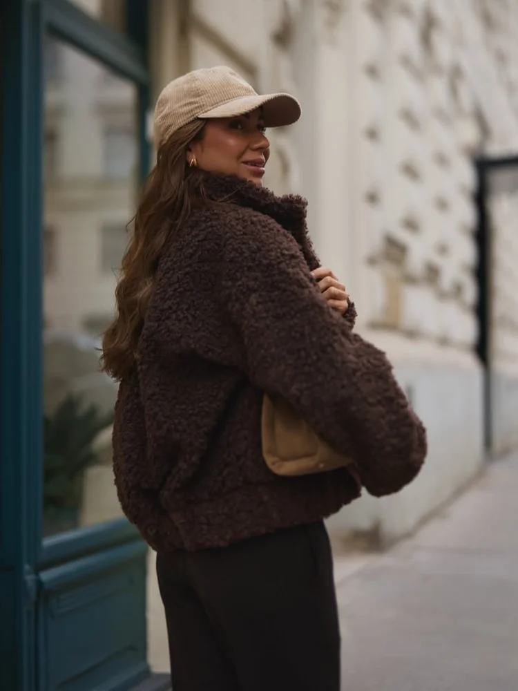 Шикарное однотонное коричневое короткое пальто из овечьей шерсти, женское повседневное свободное пальто с лацканами и воротником-стойкой на молнии с длинными рукавами, женская зимняя уличная верхняя одежда
