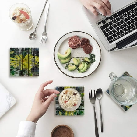 ZHANZZK Small Yellow Flower Rustic Wooden Plank Set of 4 Coaster for Drinks Absorbent Ceramic Stone Coasters Cup Mat with Cork Base for Home Kitchen Room Coffee Table Bar Decor